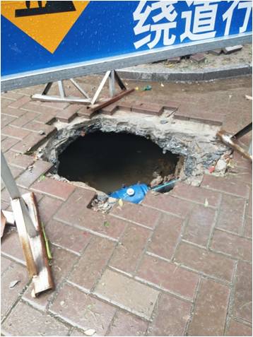 過了半個(gè)小時(shí),自來水公司的搶修人員到達(dá)現(xiàn)場,通過測聽確定地底下有水管破裂,于是施工人員破開路面,鑿開混凝土層,發(fā)現(xiàn)下面已經(jīng)被強(qiáng)大壓力的水流沖掉了一個(gè)3立方左右的大洞,因?yàn)樵摋l路是小區(qū)的支干道,只是行人走路,無重型碾壓,搶修人員表示,如果是在主干道上,汽車在上面行駛,估計(jì)早就形成地塌了。