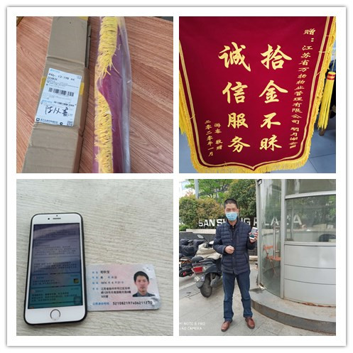 4月10日上午,萬(wàn)楊物業(yè)明月湖項(xiàng)目陳從容經(jīng)理收到一個(gè)快遞包裹。她覺得很納悶,因?yàn)榻跊]有下單采購(gòu),但是再三確認(rèn)收貨人信息確定是她本人。當(dāng)在打開包裹后,發(fā)現(xiàn)是一面錦旗。見到錦旗,她才回想起,年前項(xiàng)目上的秩序維護(hù)員陳有龍?jiān)趫@區(qū)內(nèi)巡視時(shí),撿到一只包,內(nèi)有手機(jī),錢包等貴重物品若干。因?yàn)橐粫r(shí)也沒人來(lái)認(rèn)領(lǐng),陳有龍就把包包送到園區(qū)物業(yè)辦公室登記。辦公室出動(dòng)多人在明月湖周圍尋找失主都未尋到,于是帶了包包去了公園管理處詢問(wèn)。經(jīng)核實(shí)后,公園管理處找到了失主,并歸還了他的包。