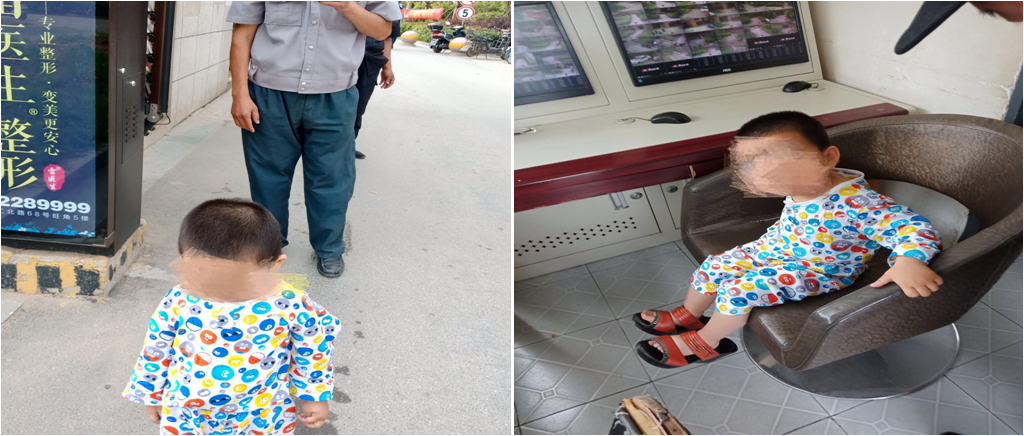 6月20日早上七點半左右,江蘇萬楊物業(yè)聯(lián)誼南園聯(lián)康苑秩序維護員張師傅在小區(qū)北門轉(zhuǎn)盤附近發(fā)現(xiàn)一名三歲的小男孩,他一個人在快遞柜附近東張西望,旁邊也沒有家長陪同,而且小朋友還穿著個大人的拖鞋,張師傅便上前進行詢問,可孩子年齡太小了,只是哭著說要找媽媽,于是張師傅便把孩子帶到北門門崗,第一時間報告給當班班長。