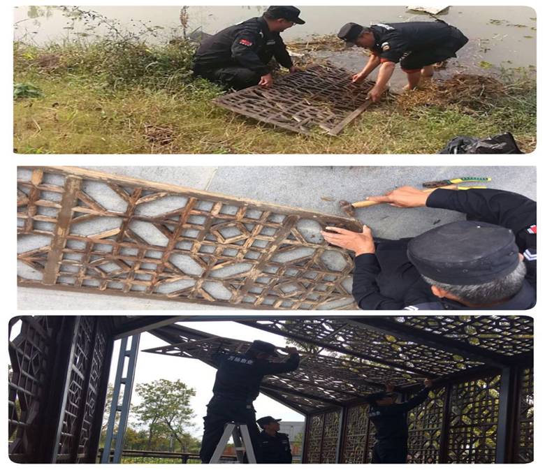次日,木匠出身的保安隊員黃仁貴承擔(dān)了修善的任務(wù),黃仁貴從便民商店買來了木膠和小鐵釘,十分小心的把斷落散架的頂板一節(jié)節(jié)有序的粘釘復(fù)位,這塊長2米、寬0.6米的精制頂板前后修復(fù)4個多小時。修理完成后的安裝環(huán)節(jié),項目經(jīng)理還特別安排值日班長嚴(yán)長國、車巡隊員方德元會同“小木匠”黃仁貴,攜帶整合后的廊亭頂板和升降云梯到達(dá)MsD廊亭現(xiàn)場進(jìn)行安裝。