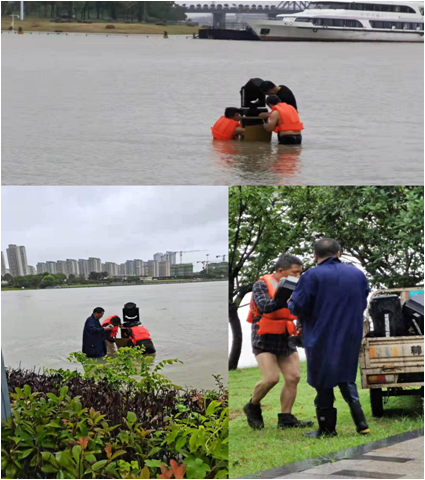 遠(yuǎn)遠(yuǎn)看去,偌大的水面,紅色的救生衣顯得特別顯眼。天空烏云密布,雨不停地打在他們的身上。三個(gè)人似乎感覺不到,依舊配合默契,小心翼翼地拆除露出水面的燈頭。經(jīng)過四個(gè)多小時(shí)的不懈努力,30盞景觀射燈完好無缺的拆好并運(yùn)送到岸邊。渾身濕透的他們看著幾十萬元的公共財(cái)產(chǎn)搶救回來,臉上露出了欣慰的笑容。