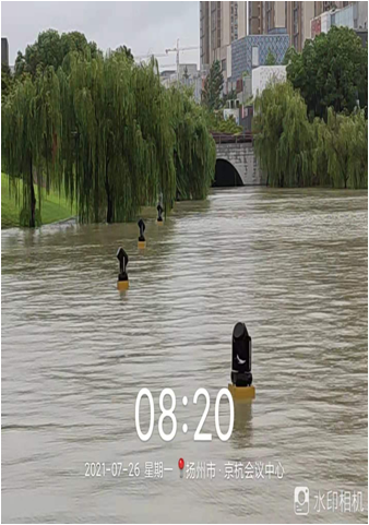 今年第6號(hào)臺(tái)風(fēng)“煙花”正在影響我市,多日的強(qiáng)降雨導(dǎo)致京杭大運(yùn)河京杭之心段水位暴漲,京杭之心“C”型湖灣周邊的景觀射燈底座支架已全部淹沒在水中。