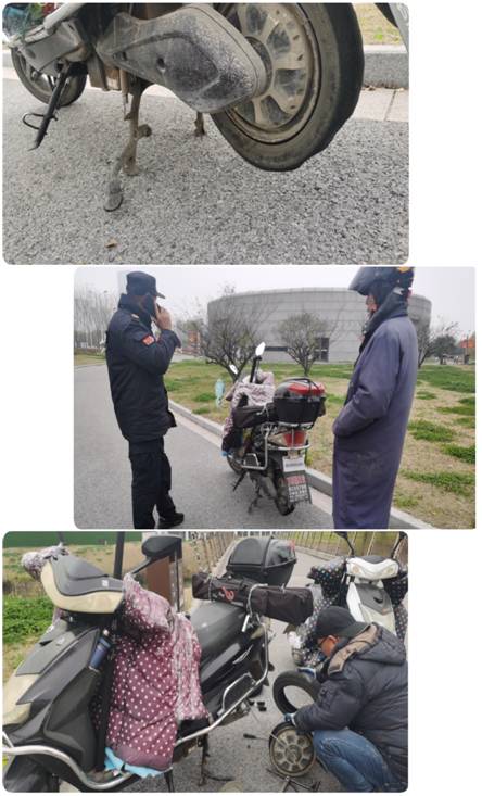 這一幕很快被附近崗亭的保安隊員徐兆春發(fā)現(xiàn)了,他三步并作兩步,來到老人身邊,幫忙先把車架起來,仔細查看發(fā)現(xiàn)車胎使用時間太長了,已無修補的價值,在征求老人的意見后,徐兆春打電話聯(lián)系修車的董師傅,請他帶新輪胎過來現(xiàn)場給老人換胎……在等修車師傅過來的間隙,徐兆春了解到:老人家姓徐,家住小商品市場附近,本來輪胎早就該換了,老人家看著還能用,就沒有及時更換……