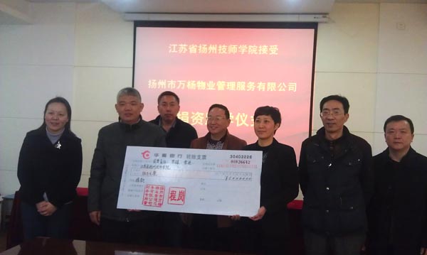 2015年04月09日下午三點在江蘇揚州技師學院精心樓四樓會議室舉辦了揚州市萬楊物業(yè)管理服務有限公司捐資助學儀式。