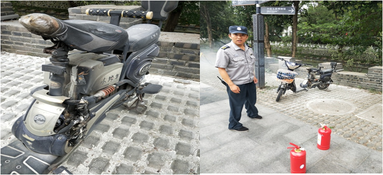 2018年9月28日下午,一輛接孩子的電動(dòng)車突然開始冒煙隨即竄出火苗,這時(shí)正在附近巡查的江蘇萬楊物業(yè)工藝坊項(xiàng)目處保安郭黎祥看到此情況立即用對(duì)講機(jī)進(jìn)行匯報(bào)并第一時(shí)間從就近的商場消火栓內(nèi)取出兩瓶滅火器一手一個(gè)飛奔現(xiàn)場,由于平時(shí)經(jīng)常參與消防安全滅火演練,所以郭黎祥到現(xiàn)場后熟練地使用滅火器對(duì)火源根部進(jìn)行噴射,及時(shí)處置了險(xiǎn)情。隨即郭黎祥在現(xiàn)場尋找車主,但是沒有找到。