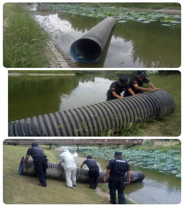 9月10日上午8點(diǎn),江蘇萬楊物業(yè)城市中央公園秩序維護(hù)隊(duì)員周隊(duì)長(zhǎng)例行巡查時(shí),在園區(qū)兒童林北側(cè)的觀光河水面上,發(fā)現(xiàn)了一根長(zhǎng)6米直徑60公分的排水管道,漂浮在水面上大煞風(fēng)景。