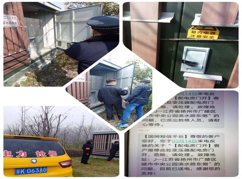 2018年3月14日上午9點左右,保安班長嚴長國、車巡隊員方德元,例行巡查至濱水路東側(cè)(朱家河閘站北),發(fā)現(xiàn)一組高壓電箱柜門大開,不設(shè)防的電器設(shè)備、裸露電纜接頭,存在著極大的安全隱患。社會人員,特別是問題人員不慎進入接觸,都有可能造成嚴重的后果。于是隊員將情況通過項目工作群進行了通報。物業(yè)負責人收獲信息后立即進行了核實查詢,確認該處高壓電柜是由揚州市電力部門統(tǒng)一管理的,物業(yè)沒有鑰匙柜門無法關(guān)閉。