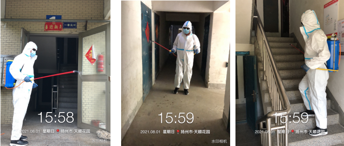 當(dāng)天下午接到社區(qū)緊急通知,天順花園三期某幢某單元為高危地域,要求物業(yè)項(xiàng)目部進(jìn)行消殺,陳義軍同志根據(jù)情況判斷,跟社區(qū)負(fù)責(zé)人說(shuō),高危單元由社區(qū)協(xié)調(diào)衛(wèi)生防疫部門(mén)進(jìn)行消殺,附近樓幢區(qū)域和單元內(nèi)由項(xiàng)目部負(fù)責(zé)消殺。作為一名退伍軍人又是一名老黨員,陳義軍毫不猶豫穿起防護(hù)服,戴上護(hù)目鏡和一次性手套,背起了沉甸甸的消殺桶,在他的影響下工程師傅也背起了另一個(gè)消殺桶,一起對(duì)周?chē)鷺菞澋膯卧T(mén)、樓道、車(chē)庫(kù)等所有公共區(qū)域進(jìn)行逐一消殺。 消殺結(jié)束后,他們脫下防護(hù)服的瞬間,已經(jīng)是汗流浹背,整個(gè)衣服全濕透了,像從水里出來(lái)的一樣。