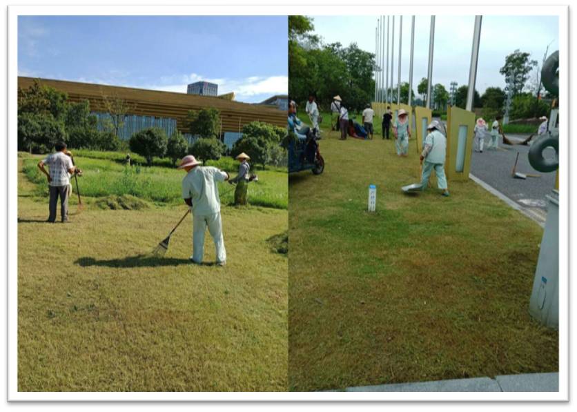 直至傍晚,大家還在汗流浹背地忙碌著,經(jīng)過清理后的大片草坪又恢復(fù)了往日的整潔、平坦,猶如一大塊綠色的地毯,園區(qū)的環(huán)境面貌煥然一新。