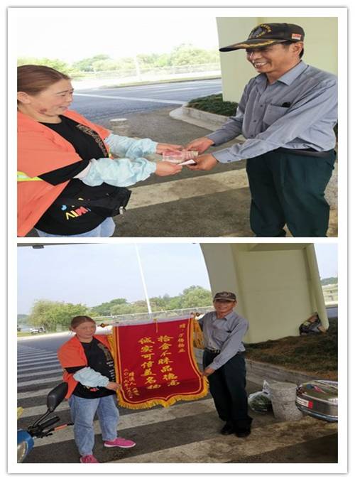 6月19日萬楊運作五部邗江項目保潔員徐云娣在真洲路與文昌交叉口清洗油污時, 路邊一輛出租出經(jīng)過,車輛帶動一陣風(fēng),刮起了不少紅色百元大鈔,徐云娣見狀忙撿起來,數(shù)了一下共2400元,當(dāng)時周圍有路過的群眾見狀,笑稱一個月工資撿回來了。但徐云娣不理會,她立即聯(lián)系項目負責(zé)人王衛(wèi)軍經(jīng)理處理。這時在路邊沿山河邊釣魚的吳學(xué)飛聽到路邊路過行人說有保潔工撿到不少錢,一摸口袋,揣在褲子口袋內(nèi)的2000多人民幣不見了。他急忙跑到路上找上徐云娣稱是他掉的,但是不能提供證明。為慎重起見,王衛(wèi)軍經(jīng)理決定報警,將錢交由警方處理。轄區(qū)新盛派出所警官來到現(xiàn)場,通過調(diào)取周邊錄相查看,才斷定2400元確實是此人所有。案情終于真相大白。