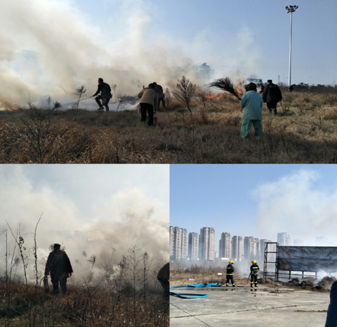 隨后,項目在崗人員保安、工程、管理人員帶著干粉滅火器,迅速來到現(xiàn)場。手拿滅火器的保安隊員熟練地擰開閥門,對著火源噴射。沒滅火工具的抓起身邊的長枯樹枝使勁地拍打火源處。附近的保潔阿姨們也扛著大掃帚匆匆趕來,加入了滅火的隊伍。她們用大掃帚對著火苗一陣猛打。大家滅完了一處又來到另一處。有序而迅速地撲滅大火。