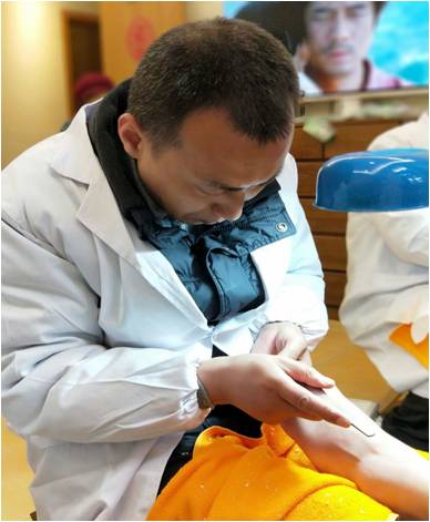 活動的主要服務(wù)項目是修腳,志愿者們給業(yè)主準(zhǔn)備好溫度適宜的泡腳水,業(yè)主們便開始享受大師修腳服務(wù)。只見大師們一個個面帶微笑,熱情高漲的為業(yè)主們服務(wù)著,大家坐在舒適的沙發(fā)上,不時與大師們進(jìn)行交流:“請大師把我的刺窩處理一下”。“請大師把我的嵌指解決一下”......大師們揮舞著小小的修腳刀,不停的在忙碌著,不時根據(jù)需要更換刀具。在大師們的辛勤操作下,業(yè)主們的腳疾一掃而光,大家露出了滿意的笑容。不愧是非遺大師,技藝就是不一般!業(yè)主齊聲夸贊師們。