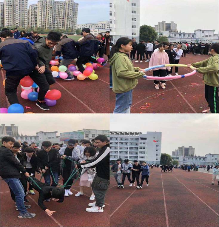 此次戶外活動由”師生綁腿跑”、“鉆山洞”、“踩氣球”、“隔空取物”四個小游戲組成。下午三點比賽正式開始,先是“師生綁腿跑”,分為三組,每一組由班主任帶領(lǐng)班上的三名學生共同合作完成,由于綁著腿一開始每組成員都走的搖搖晃晃,后來有的組逐漸有了默契只見他們肩并肩,手挽手大步的走到了終點。最精彩的要數(shù)“踩氣球”了,只見他們每人每只腳上都綁了五個氣球,比賽一開始他們就虎視眈眈的沖向?qū)Ψ剑麄兗纫翱、準、狠”的踩爆對方的氣球,也要小心翼翼的保護自己的氣球,看!還有人不小心踩爆了自己的氣球,氣得只拍自己的腦袋。賽場外的觀眾們時而鼓掌加油,時而歡笑連連,就連在場的學院領(lǐng)導(dǎo)們也不約而同的舉起了手機留下這美好的時刻。