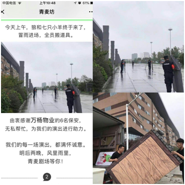 9月18日上午,一輛裝滿大型道具的貨車停在了市民廣場西門出入口,車旁的幾名工作人員面露難色。物業(yè)保安老張熱情地上前詢問是否需要幫忙。原來他們是廣場4號樓7F青麥坊的工作人員,貨車里裝的是人偶童話劇《狼和七只小羊》劇組的所有道具。他們現(xiàn)在要將道具搬至7樓的演出會場。由于人手不夠,天又下著雨,道具較多,還有一些大型道具無法進入電梯,需要走樓梯搬到7樓,青麥坊的工作人員介紹完情況后,請求物業(yè)給與幫忙。保安老張,將這一情況立即匯報給項目負責(zé)人,項目負責(zé)人立即協(xié)調(diào),按照對方要求抽調(diào)了6名保安師傅全力進行道具的搬運。