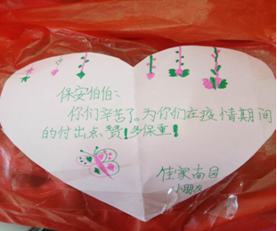 在全國人民響應(yīng)黨中央號召,共同防疫新型冠狀病毒阻擊戰(zhàn)中,江蘇萬楊物業(yè)佳家南園項目部,繼上次好心人贈送84消毒液后,2月20日上午10點又出現(xiàn)溫馨的一幕:一位小朋友在奶奶的陪同下,來到了佳家南園西門崗,向堅守在防疫工作的萬楊物業(yè)工作人員送來了糕點及水果表示慰問,并自制心型卡片,上面寫著“保安伯伯,你們辛苦了,為你們在疫情期間的付出點贊!多保重!”卡片上畫了綠葉紅花,有一只蝴蝶在翩翩起舞!祈禱春暖花開,防疫勝利。小朋友的舉動,感動了在崗的各位物業(yè)工作人員,這張卡片包含了小朋友對物業(yè)人員的感激,也是廣大業(yè)主對物業(yè)人防疫工作的認可。大家雖然辛苦,但是為了維護小區(qū)業(yè)主的安全,物業(yè)人會竭盡全力做好這場防疫防控工作,做業(yè)主的守護者。