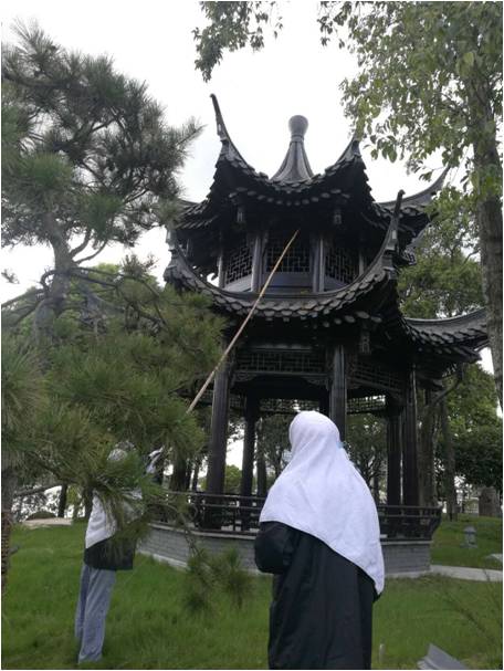 8月28日下午4點(diǎn),在明月湖休息涼亭邊上江蘇萬楊物業(yè)項(xiàng)目的兩名工作人員,穿著厚厚的衣服,頭部也用厚毛巾裹得嚴(yán)嚴(yán)實(shí)實(shí)的,手上還拿著一根似乎有4-5米的長桿在涼亭屋檐下?lián)v鼓著,他倆全副武裝的這是要干嘛?