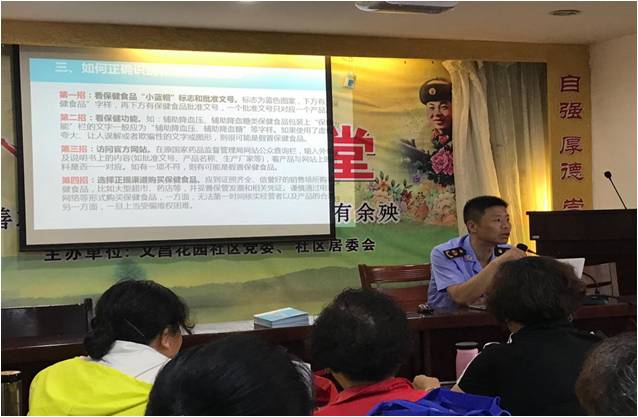 現(xiàn)代人越來越重視養(yǎng)生保健,應(yīng)生出五花八門的保健品,很多保健品銷售商夸大保健作用,迷惑誤導(dǎo)廣大消費(fèi)者購買。為讓小區(qū)居民科學(xué)食用,不盲目選購保健食品。6月27日上午,萬楊物業(yè)文昌花園項(xiàng)目部與文昌花園社區(qū)特請(qǐng)來廣陵區(qū)市場監(jiān)督管理局和市場監(jiān)督管理局曲江分局的工作人員前來,為小區(qū)居民、志愿者普及保健品安全知識(shí)講座。