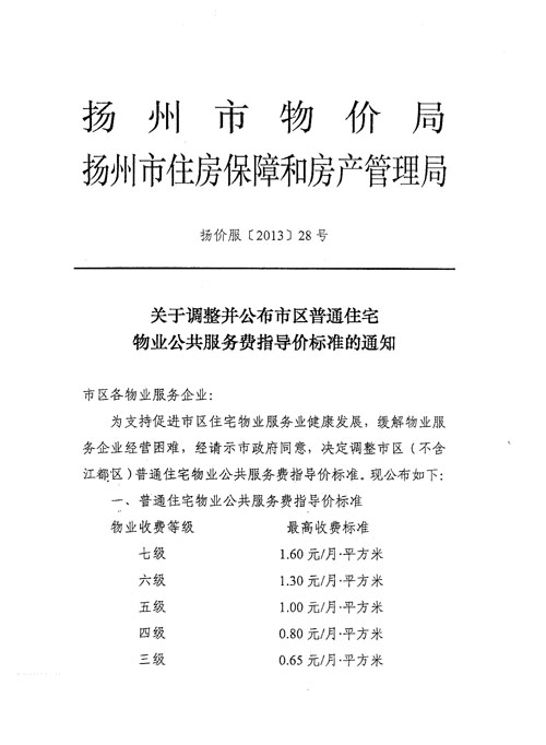 關于調整并公布市區(qū)普通住宅物業(yè)公共服務費指導價標準的通知