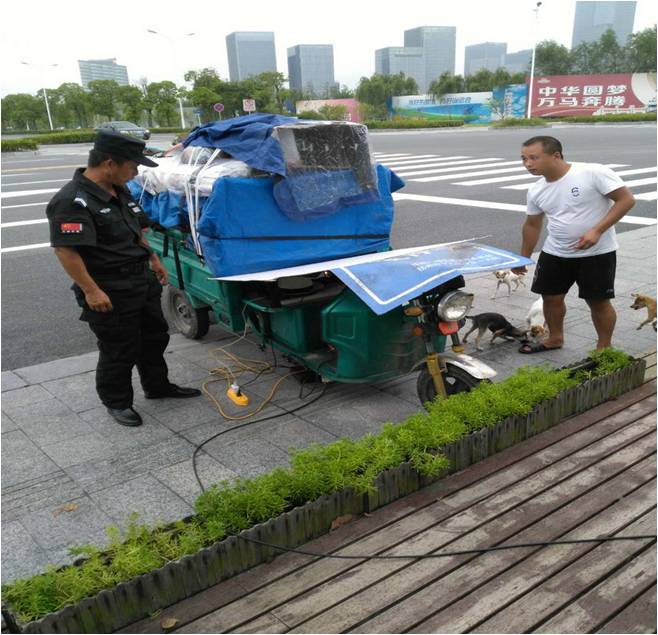“便民助民服務(wù)不是說(shuō)在嘴上,要切實(shí)的體現(xiàn)在言語(yǔ)和行動(dòng)中,”這也是園區(qū)物管處的一貫要求。隊(duì)員王永洪收到值日班長(zhǎng)的指令后,立即騰出了一個(gè)插座給馬先生三輪車充電。