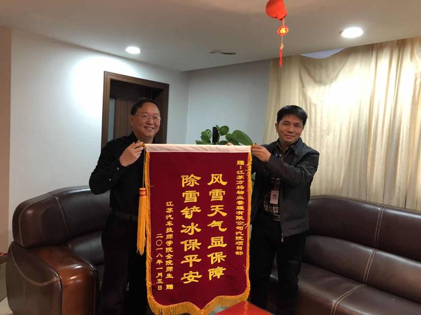功夫不負(fù)有心人。2018年1月16日陰雨綿綿,寒風(fēng)襲人,華遠(yuǎn)國際大廈501室人頭躦動,熱鬧非凡,江蘇汽車技師學(xué)院領(lǐng)導(dǎo)一行幾人為對合作工作多年的江蘇萬楊物業(yè)管理有限公司的工作成績給予肯定和勉勵,代表全體師生給萬楊物業(yè)送來錦旗。