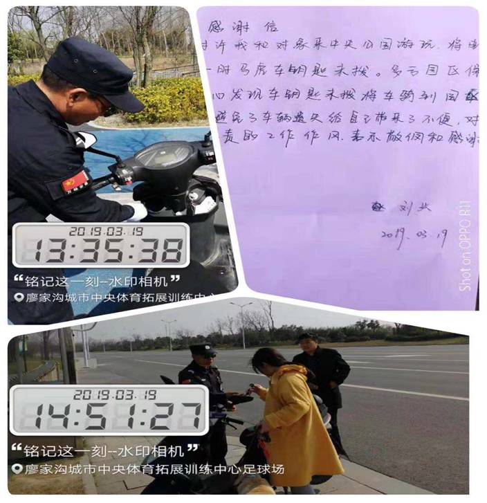 隊員們下車查看發(fā)現(xiàn)電動車完好無損,分析認為可能是車主粗心大意鑰匙未拔,在園區(qū)游玩垂釣。于是董班和隊員金海山分頭尋找河邊的垂釣者,均無車主認領的信息,臨近區(qū)域查找還是沒有車主的信息;為了車輛的安全,隊員金海山將車騎到了園區(qū)一號崗亭妥善看管,并通過城市中央公園工作群將情況進行了通報,便于車主領回車輛。